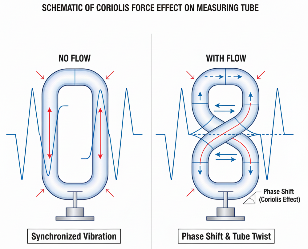تورط قوة كوريوليس: عندما يبدأ السائل أو الغاز بالتدفق عبر الأنابيب المهتزة بسرعة عالية، تحاول جزيئات السائل المتحركة، بسبب القصور الذاتي، مقاومة الاهتزاز الدوري للأنابيب. على جانب المدخل، يقاوم السائل دفعه بعيدًا عن مركز الاهتزاز؛ على جانب المخرج، فهو يقاوم سحبه للخلف. تُعرف قوة التفاعل هذه في الفيزياء باسم "قوة كوريوليس".